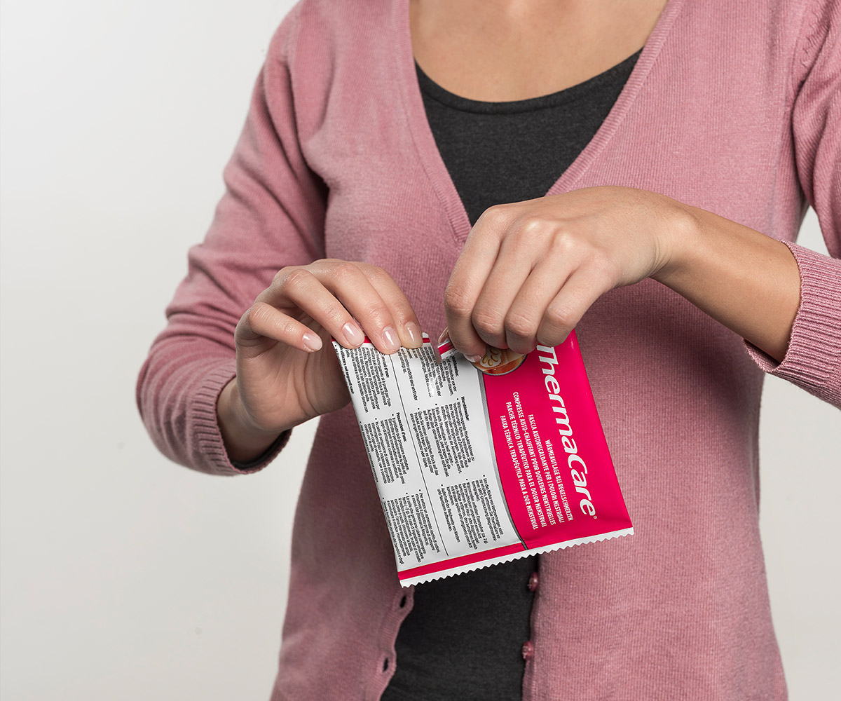 Öffnen Sie die luftdichte Verpackung direkt vor der Anwendung und entnehmen Sie die ThermaCare® Wärmeauflage. Bei Kontakt mit Sauerstoff beginnt die Erwärmung der Wärmezellen.